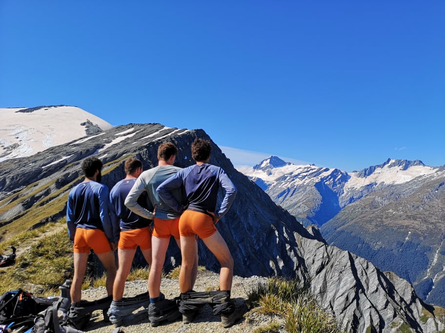 בתמונה: ארבעה עלמי חן מדגמנים חולצות דרייפיט ותחתוני בוקסר מצמר מרינו בפארק הלאומי אספיירינג.